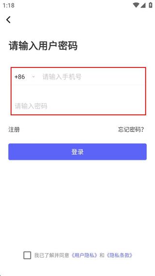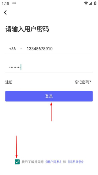 3、输入手机号和密码,勾选我已了解并同意用户隐私和隐私条款,点击登录按钮。