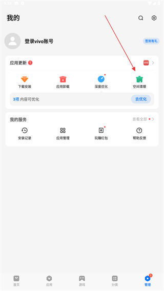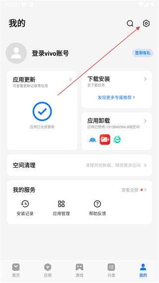 1、打开vivo应用商店进入首页,点击设置图标,进入应用商店的设置。