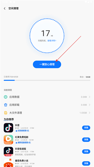 4、进入空间清理的页面内,点击一键放心清理的按钮即可清除。