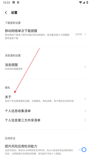 2、在设置页面找到关于选项,点击该选项进入应用商店的相关信息界面。