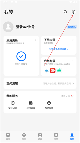 1、打开vivo应用商店进入首页,点击底部导航栏的我的选项进入个人界面。