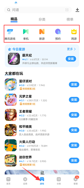 2、在【游戏】栏目,上方有根据游戏不同类型进行细致划分,若是没有目标,可以看看大家都在玩的游戏,都是网上最火热最受欢迎的游戏;