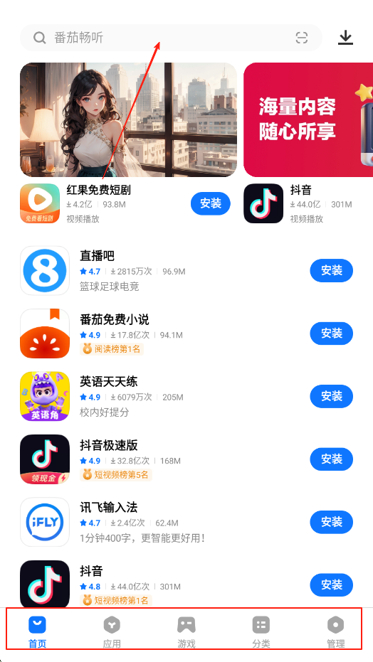 1、打开应用商店,在首页顶部搜索框中输入想要查找的应用名称,等待搜索结果加载出来,也可直接浏览首页推荐的各类应用。