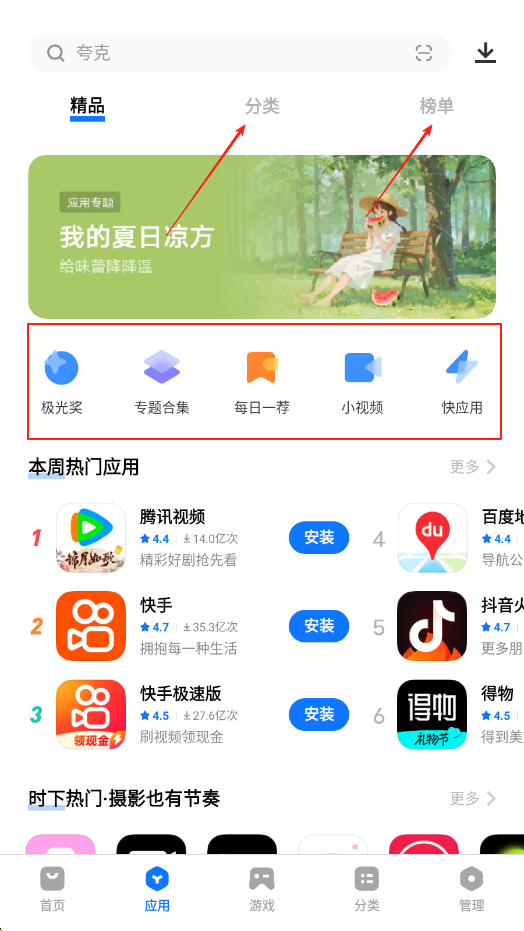 2、点击底部应用选项,进入应用页面,可查看精品,分类,榜单等板块,还能通过极光奖,专题合集等快捷入口,快速找到优质应用。