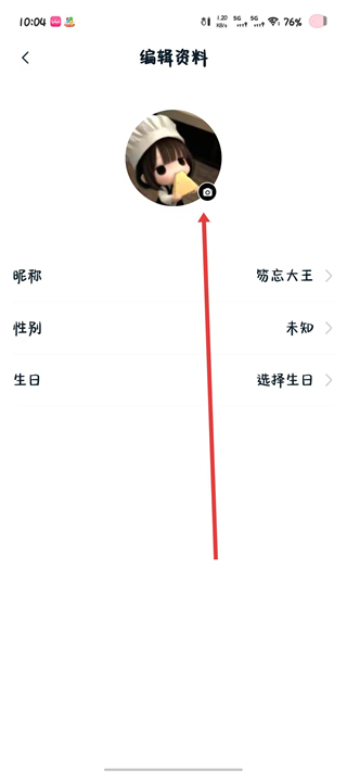 3、在编辑资料界面找到头像区域的相机图标,点击图标弹出更换头像的选项。