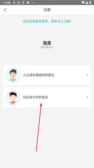 3、在注册页面选择身份,如社区或诊所的医生。