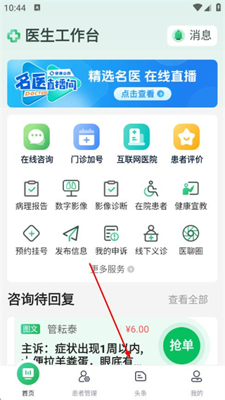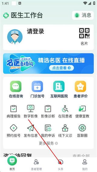 1、在健康山西医生版app的医生工作台页面,点击底部头条,进入头条页面。
