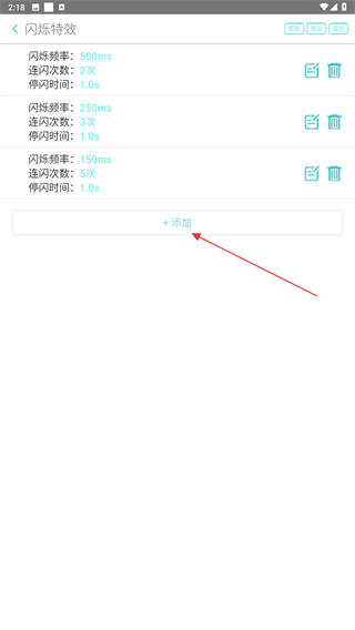 3、同时进入到闪烁特效的页面内,点击+添加的按钮。