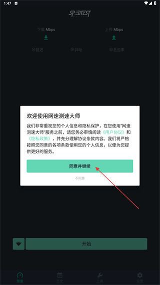 1、打开网速测试大师APP,进入时会跳出欢迎语,点击同意并继续的按钮。