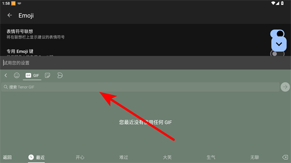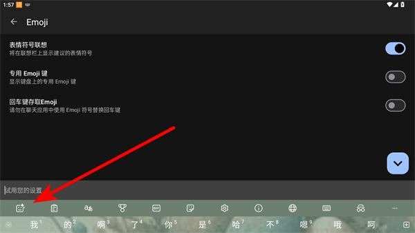 3、将表情符号联想开关开启,即可在联想栏上显示建议的表情符号。
