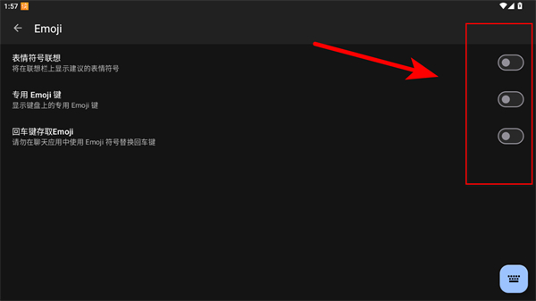 2、在Emoji设置页面,能看到表情符号联想、专用Emoji键、回车键存取Emoji的开关。