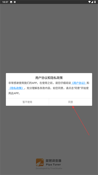 1、启动琵琶调音器的应用软件,进入时会跳出用户协议和隐私政策,点击同意的按钮。