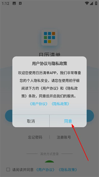 1、在用户协议与隐私政策弹窗中,点击同意,进入登录页面。