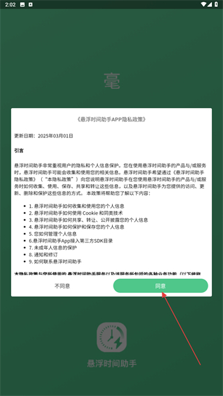 1、打开悬浮时间助手APP,进入时会弹出隐私政策,点击同意的按钮。