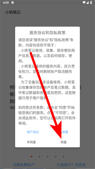 1、打开小筑笔记,在弹窗中点击同意,进入主界面。