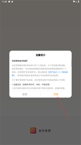 1、打开金舟投屏APP,进入时会弹出温馨提示,阅读后点击同意的按钮。