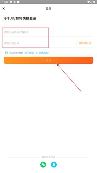 4、在手机号/邮箱快捷登录的界面内,输入要登录的手机号、验证码,再点击登录的按钮即可。