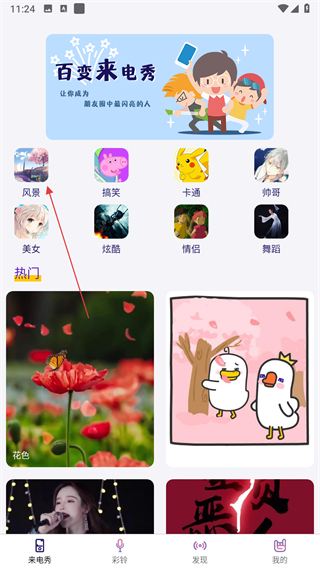 1、打开来电秀类应用,进入来电秀页面,点击喜欢的分类图标,进入该分类的素材列表页。