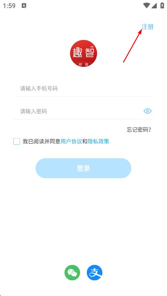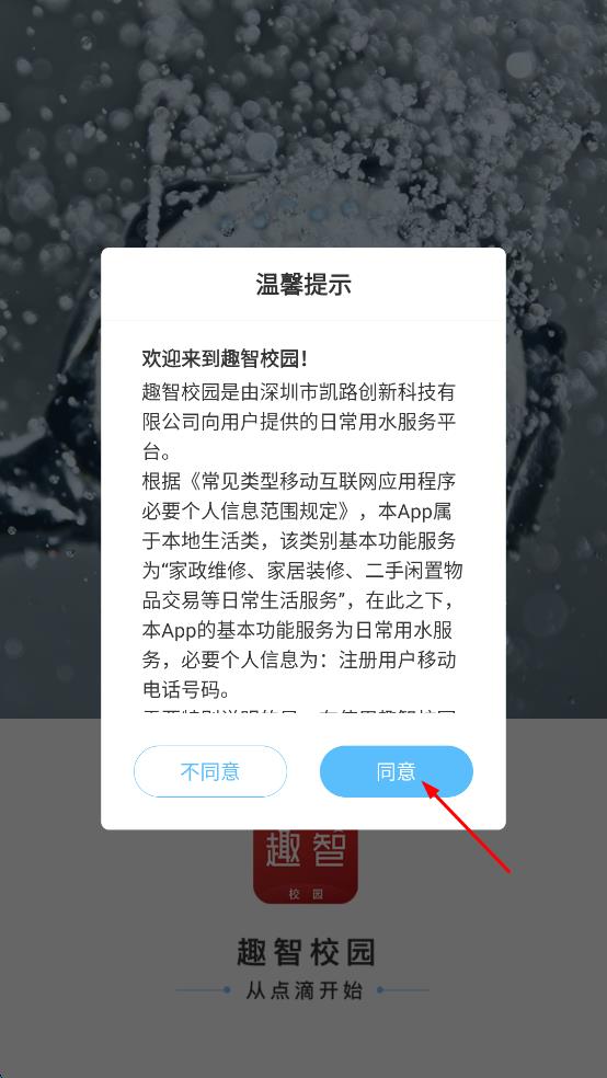 1、打开趣智校园,在弹出的温馨提示页面,点击同意,进入登录页面。