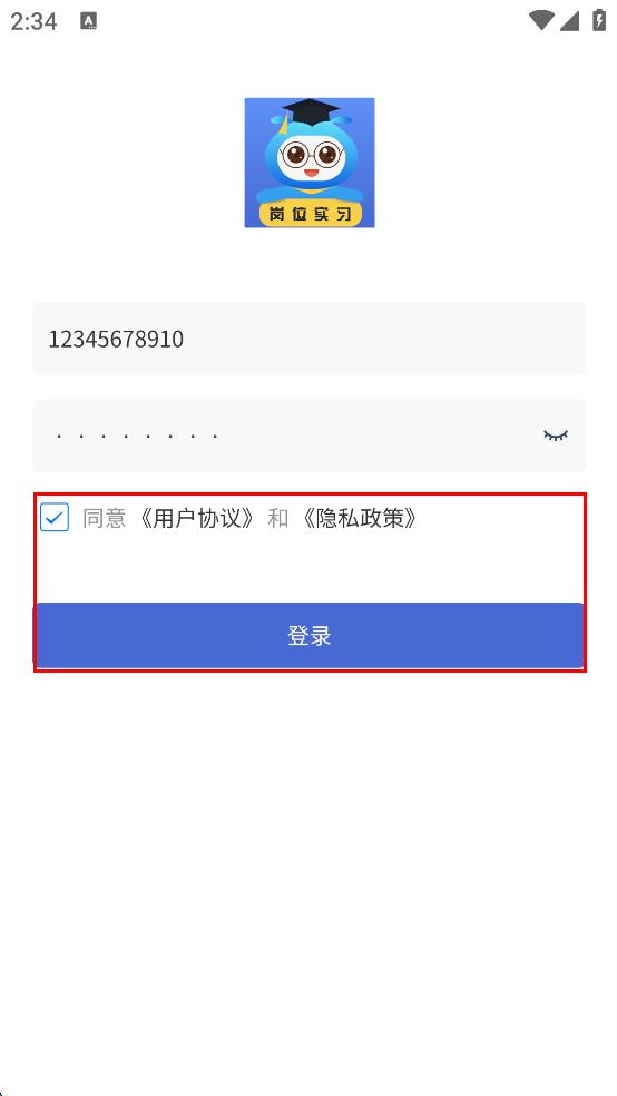 4、勾选同意相关协议和政策,点击登录,即可完成岗位实习的登录。