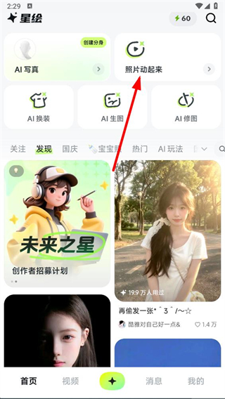1、打开星绘app,在首页中找到并点击照片动起来的选项,进入AI视频生成页面。