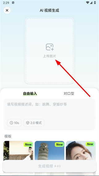 2、在AI视频生成页面,点击上传图片区域,从设备中选取想要处理的照片。