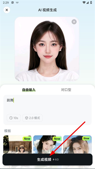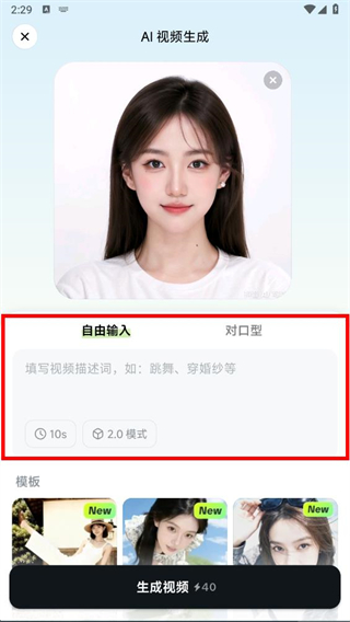 3、上传照片后,在自由输入或对口型栏里,填写对视频的描述词,比如跳舞。