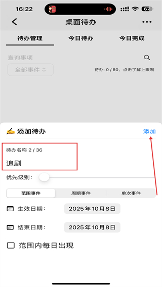 3、在下方弹出的页面内,输入待办名称,再点击添加的按钮。