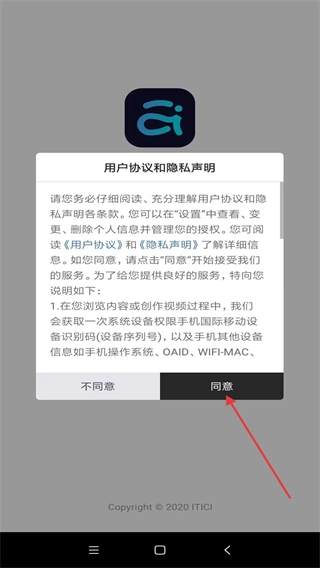 1、打开提词器爱提词APP,进入时会弹出用户协议和隐私声明,阅读后点击同意的按钮。