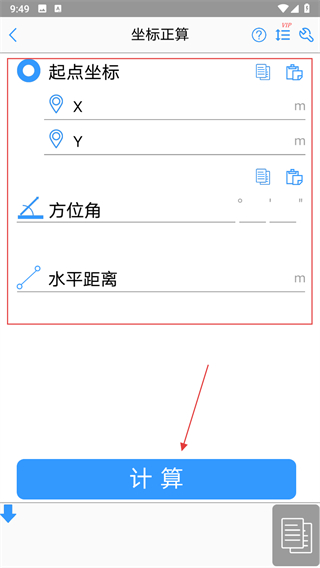 3、在坐标正算页面,依次输入起点坐标、方位角以及水平距离,输入完成后点击计算按钮。