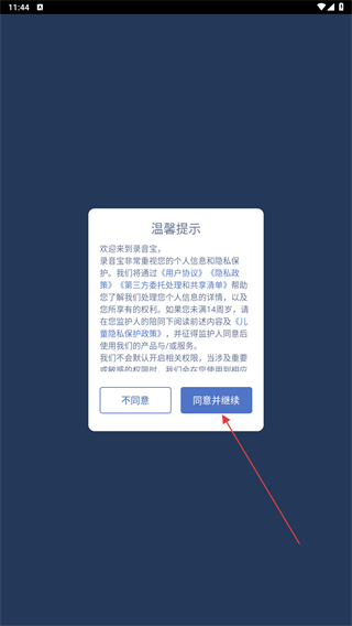 1、打开讯飞录音宝APP,进入时会跳出温馨提示,点击同意并继续的按钮。