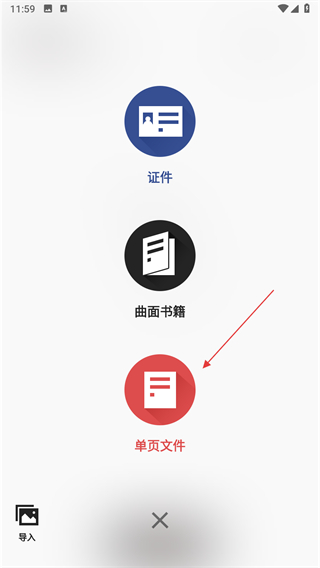 2、弹出包扫描类型选择界面,在弹出的扫描类型选择界面中,点击单页文件选项。