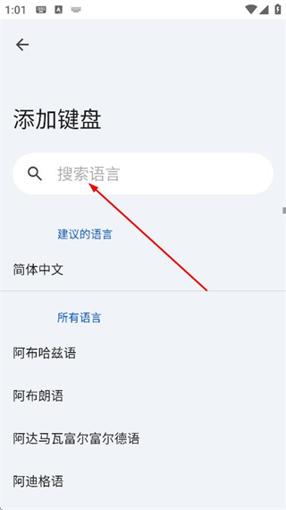 3、在添加键盘页面,点击搜索语言的搜索框,可搜索要添加的语言。