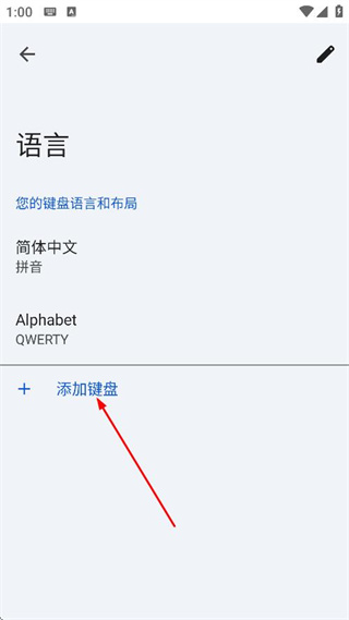 2、在语言设置页面,点击添加键盘,进入添加键盘页面。