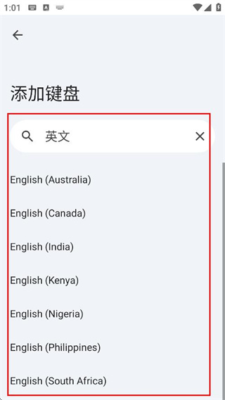 4、在搜索框中输入英文,可查看相关英文键盘选项,选择后添加英文键盘。