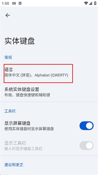 1、在实体键盘设置页面,点击语言,进入语言设置页面。