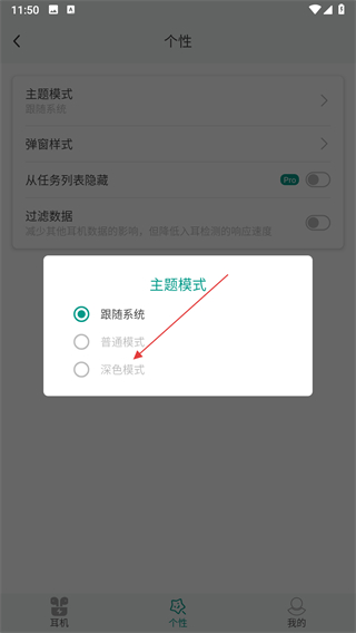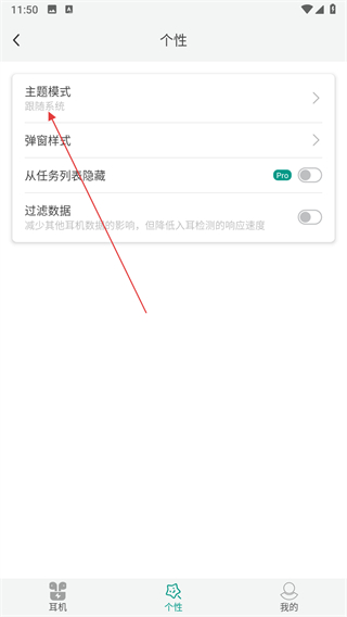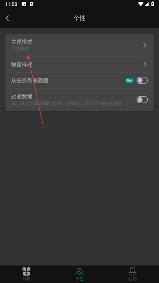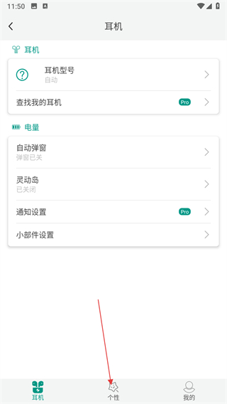 1、打开PodsTool应用,在耳机页面点击底部的个性选项,进入个性设置界面。