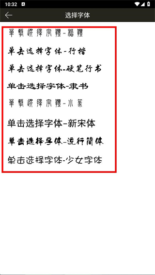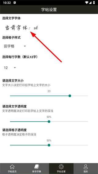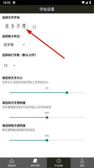 2、在字帖设置页面,点击选择文字字体区域,进入字体选择界面。
