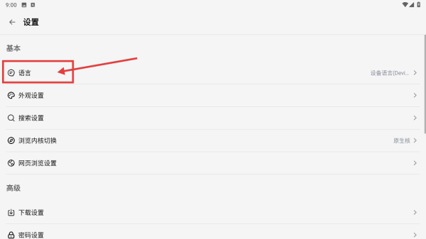 3、在设置页面,点击语言选项,进入语言选择弹窗。