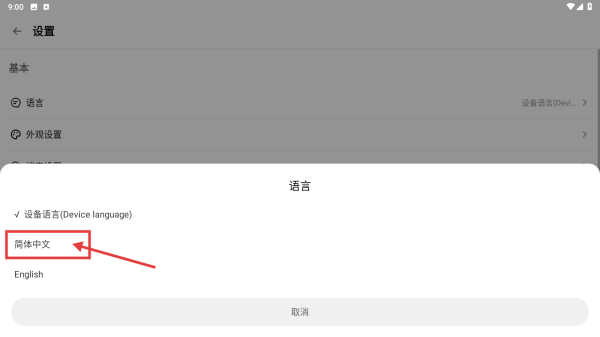 4、在语言选择弹窗中,点击简体中文选项,完成语言设置操作。