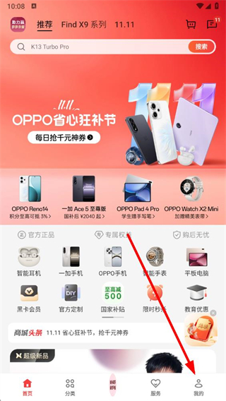 1、打开oppo商城app,点击底部导航栏中的我的选项。