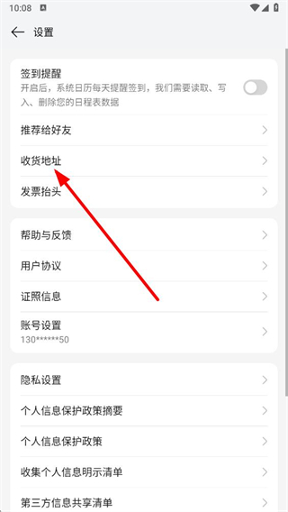 3、在设置界面里,找到并点击收货地址选项,进入管理收货地址页面。