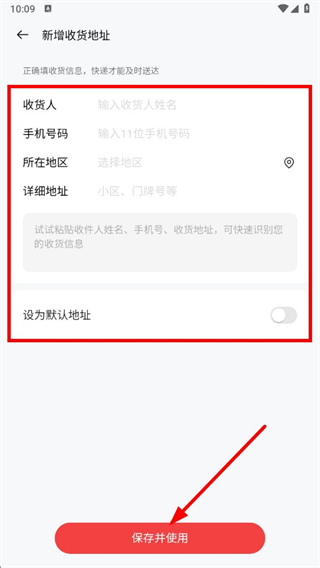 5、在新增收货地址页面输入收货人、手机号等信息,点击保存并使用即可完成添加。