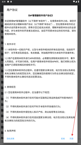 1、打开np管理器APP,进入时会弹出用户协议,仔细阅读后点击同意的按钮。