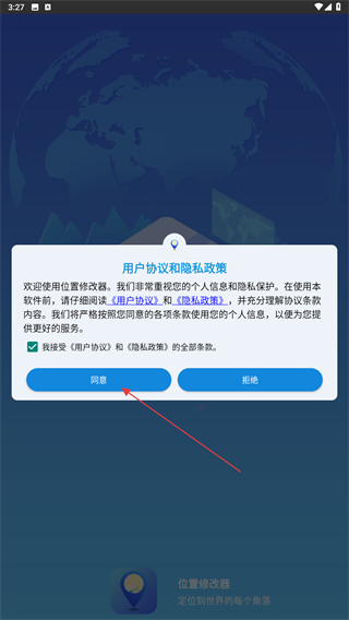 1、启动位置修改器的应用软件,进入时会跳出隐私政策,勾选后点击同意的按钮。