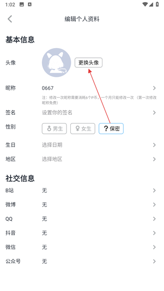 3、在编辑个人资料界面里,点击更换头像按钮。
