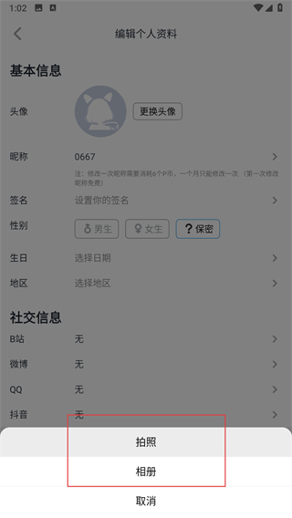 4、根据需求选择拍照或相册,选取合适的图片,完成头像修改。