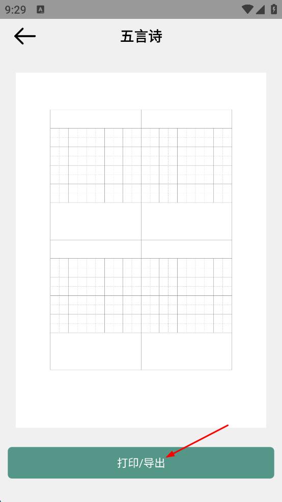 4、进入五言诗练字帖页面后,点击底部的打印/导出按钮,进行后续打印或导出操作。