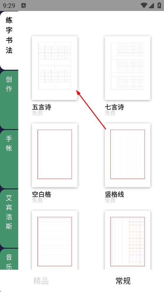 3、在常规页面中,找到五言诗练字帖模板,点击该模板。