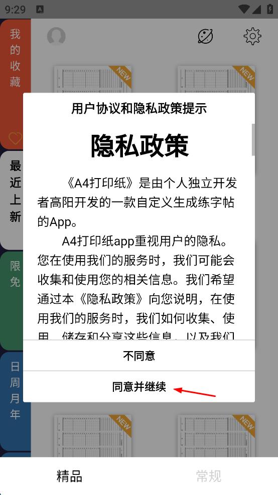 1、打开A4打印纸App,会弹出用户协议和隐私政策提示框,仔细阅读后,点击同意并继续按钮。